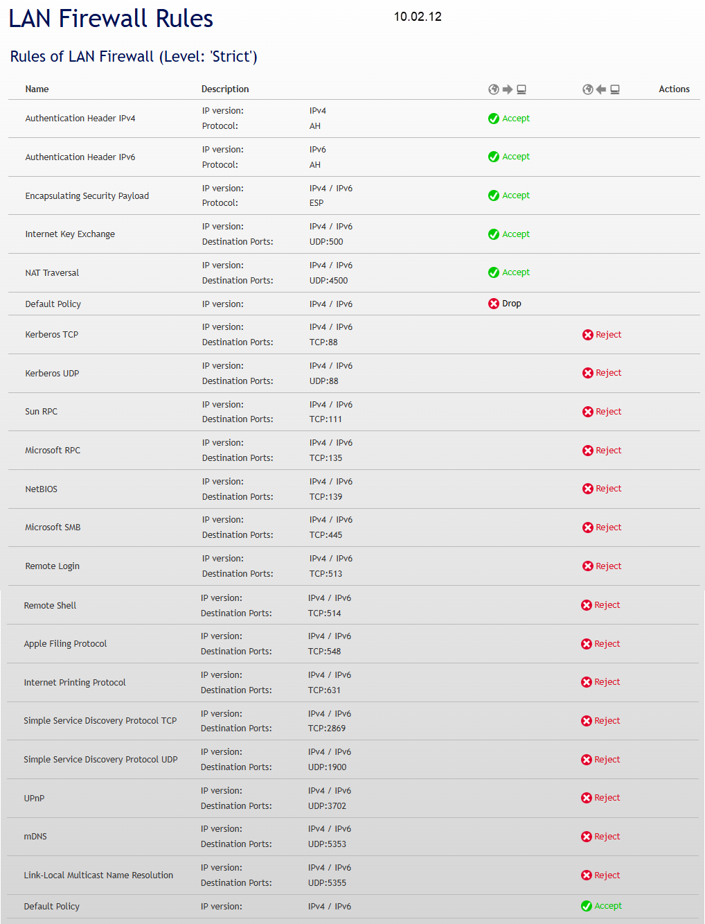 The firewall mode "Strict" remains unchanged after the firmware update. All existing firewall rules are automatically adopted. Rules that were implicit or hidden in the previous firewall are now transparent and visible in the new firewall (e.g., IPsec), without changing the security behavior.